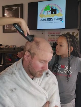 At the start of her treatment, Diane’s friends answered the call for support. Ryan Wilson from The Blind Center and Youtubers Katy & Vikki and Angel & Crystal became the founding members of the “Dirty Dianes” when they shaved their heads and raised an impressive amount of money for the newly established FearLESS Living Fund.